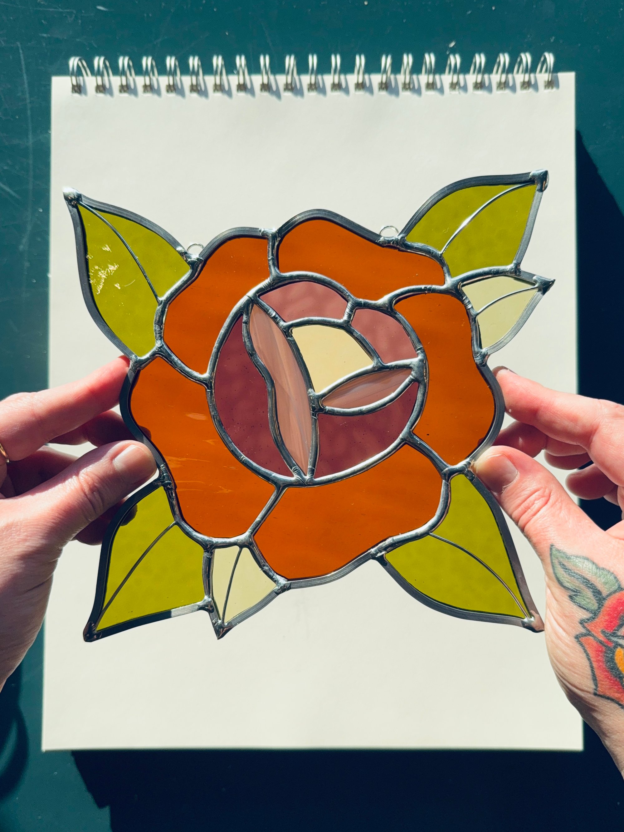 stained glass rose sun catcher with wire detail. hanging chain attached. approximately 8" around.
