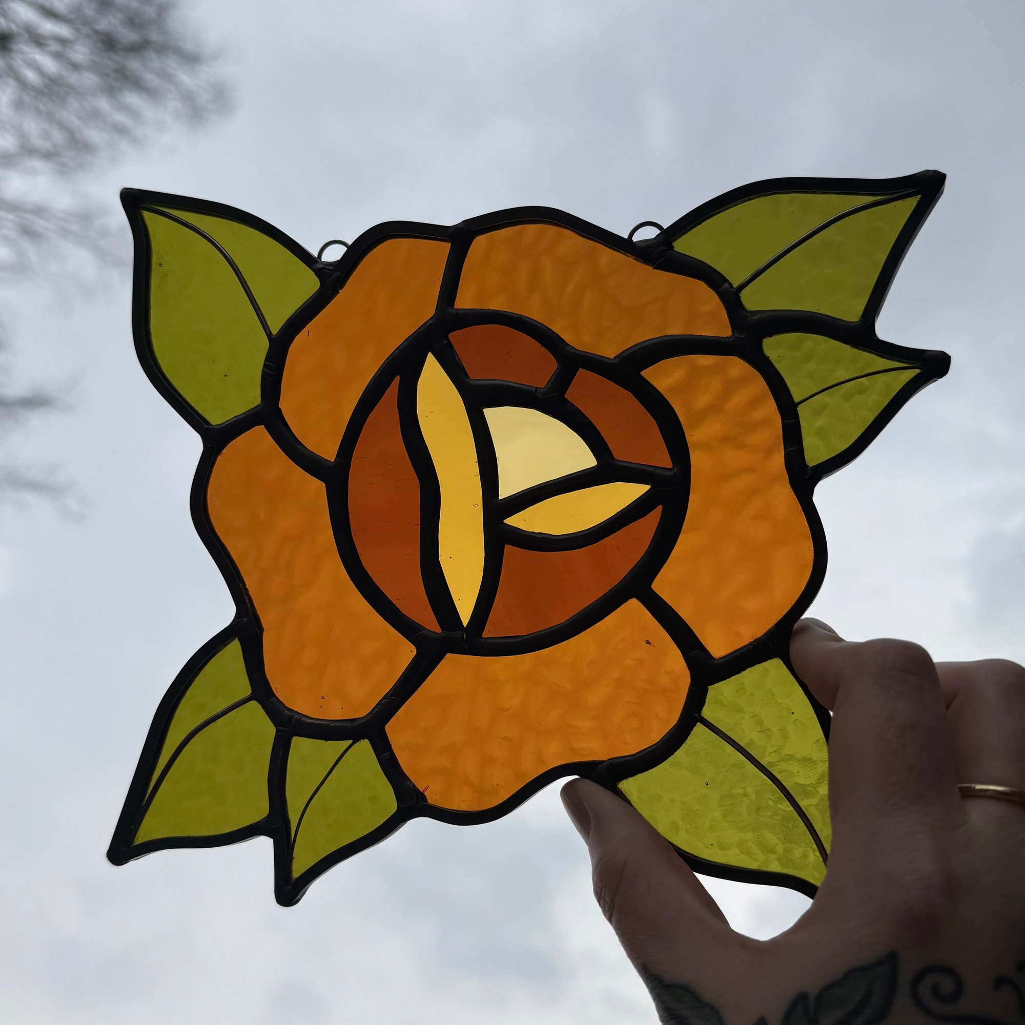 stained glass rose sun catcher with wire detail. hanging chain attached. approximately 8" around.