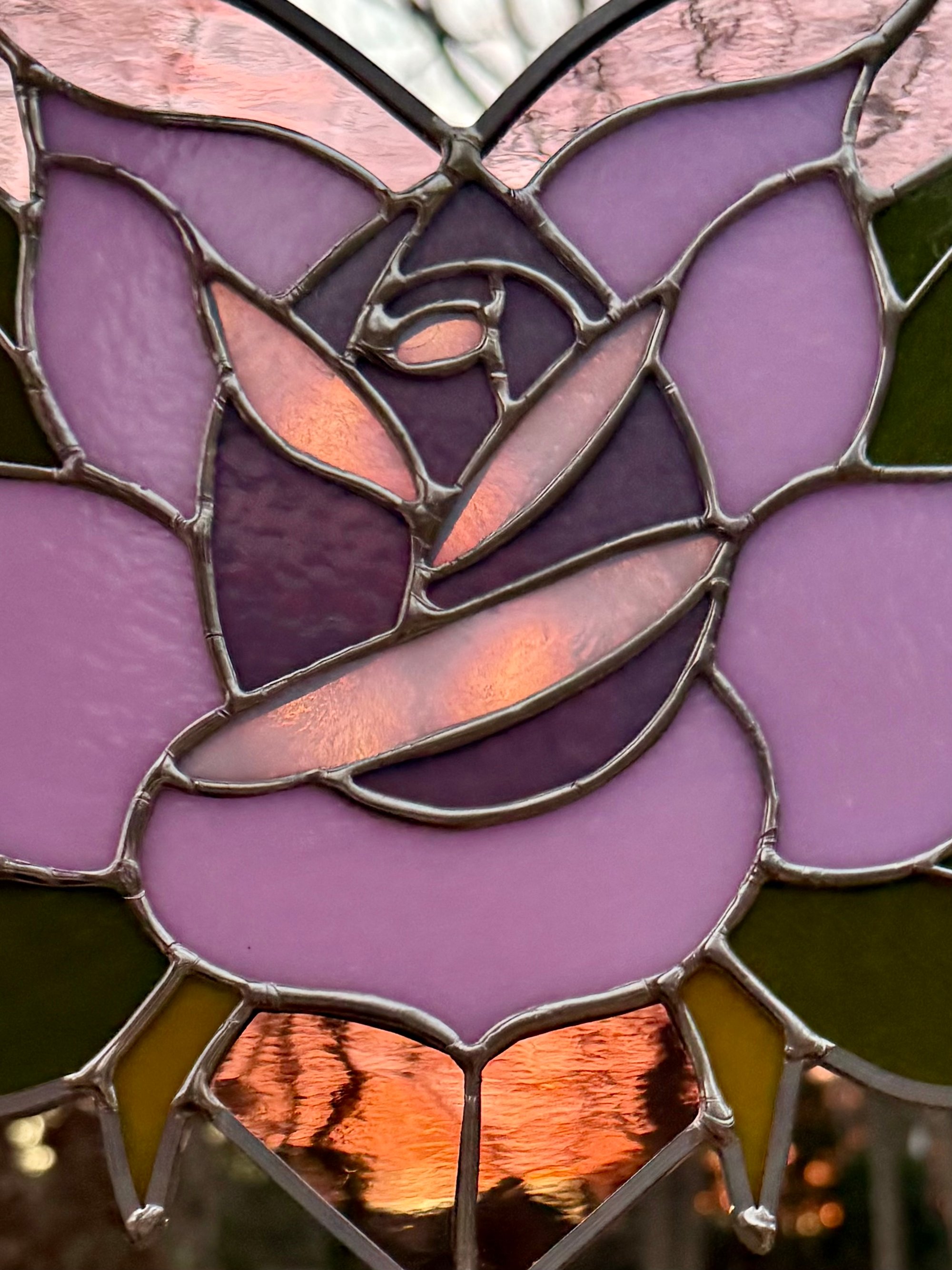 lavender rose and pink heart stained glass sun catcher with wire detail. hanging chain attached. measures approximately 9" around.