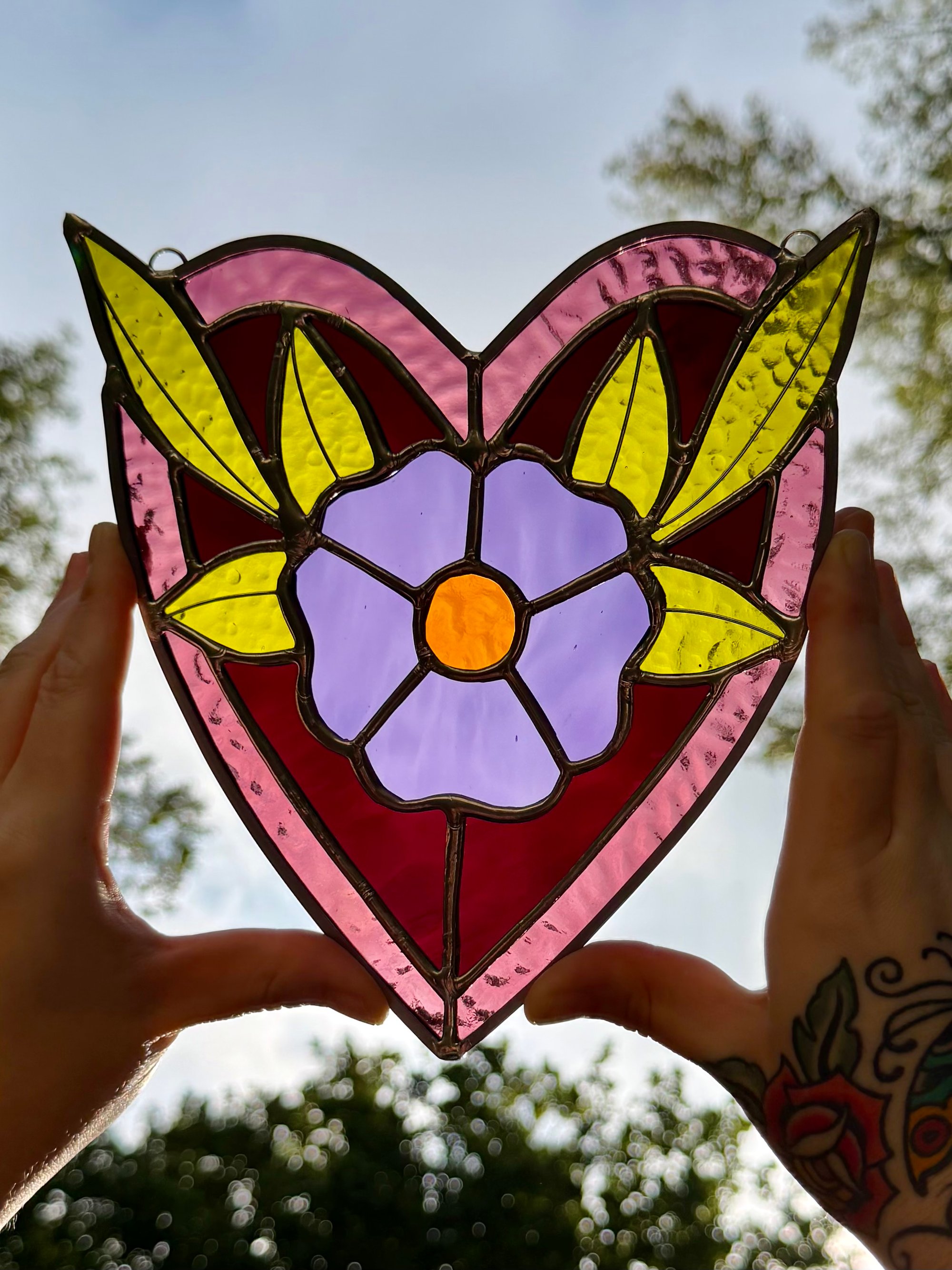 flower heart stained glass sun catcher. measures approximately 8" by 8".