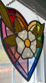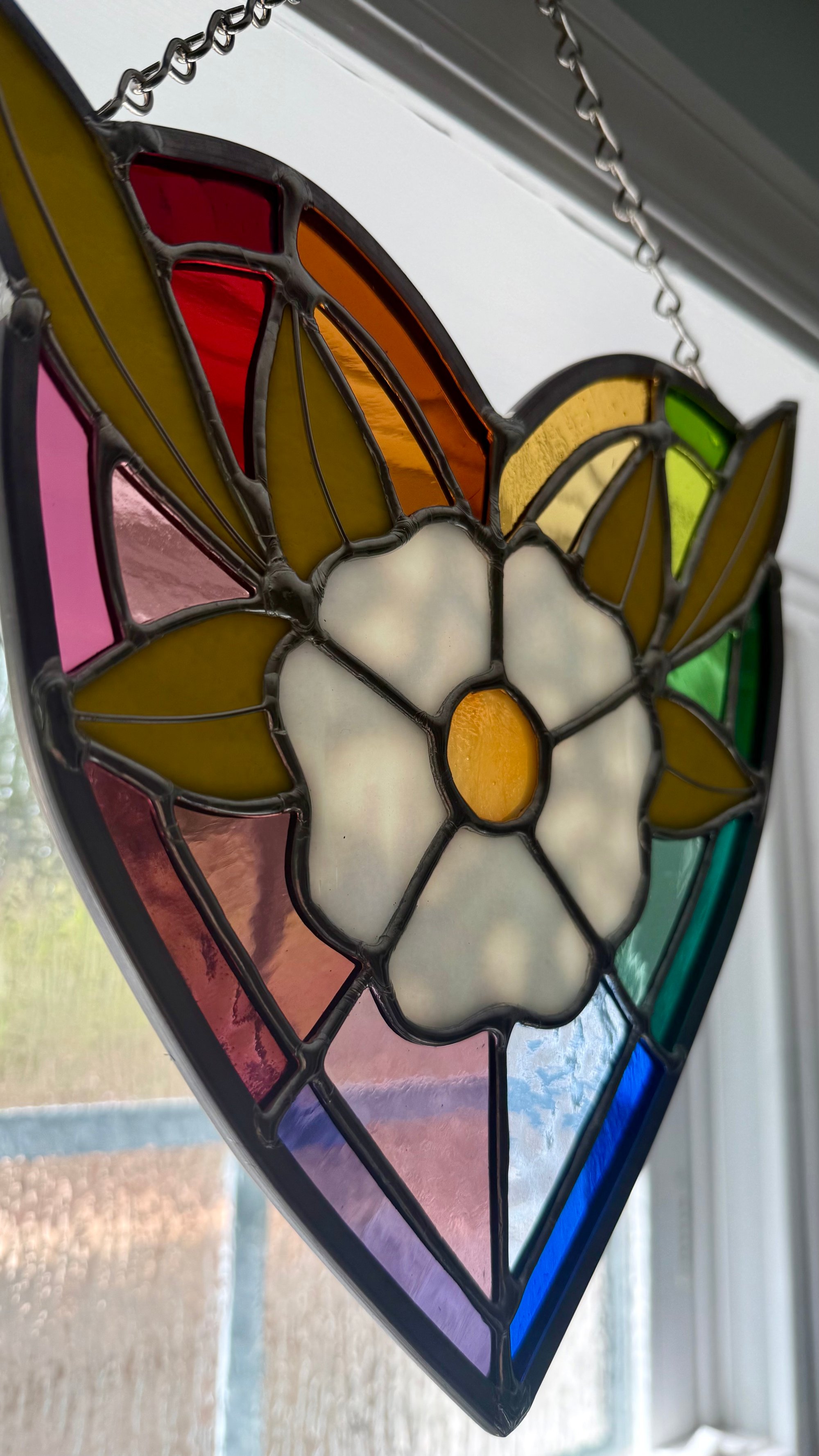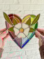 flower heart stained glass sun catcher. measures approximately 8" by 8".