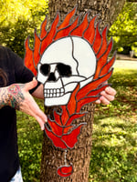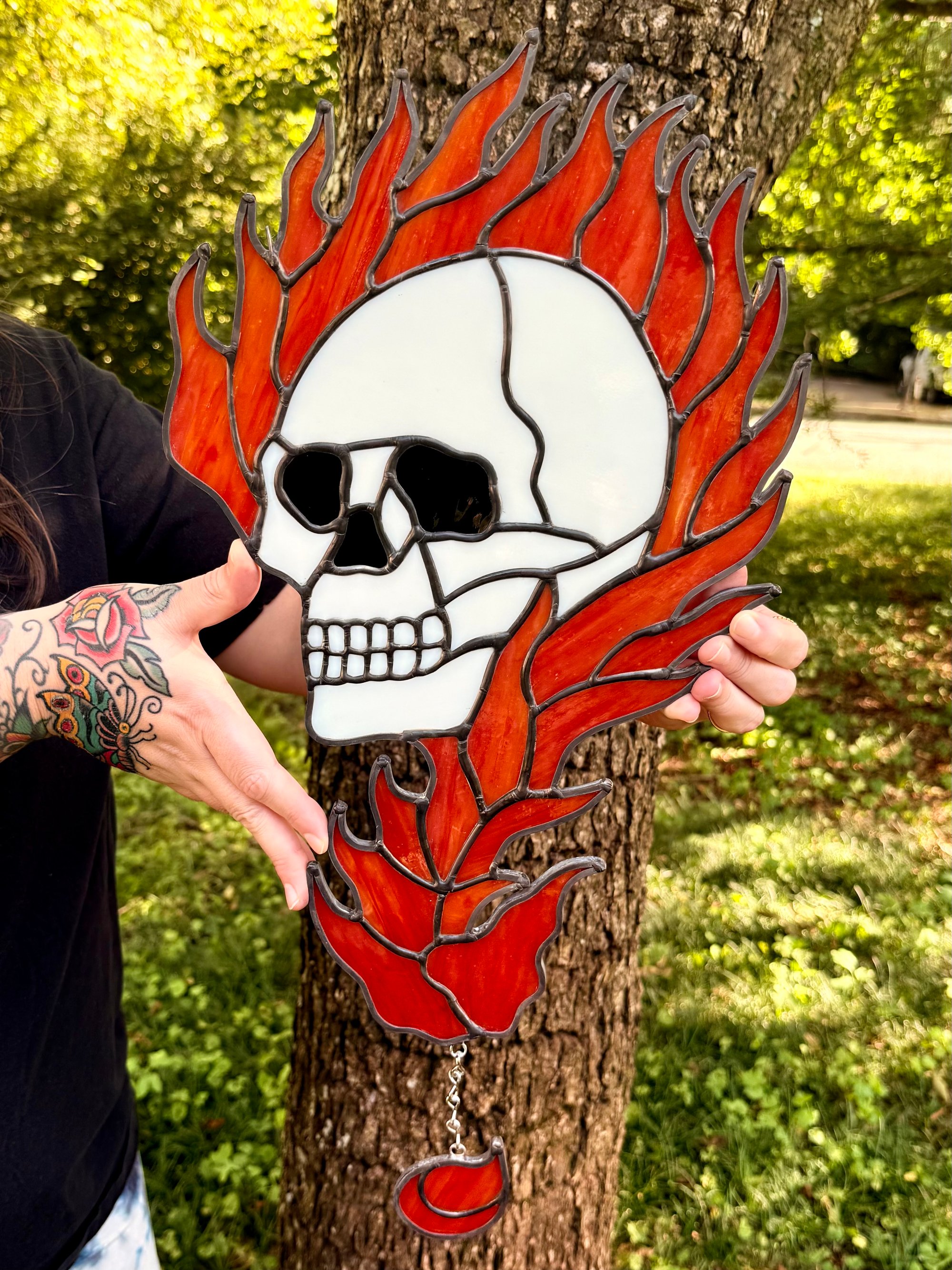 this piece features an opaque off-white and black skull with semi-transparent blood orange flames. black hanging chain attached.