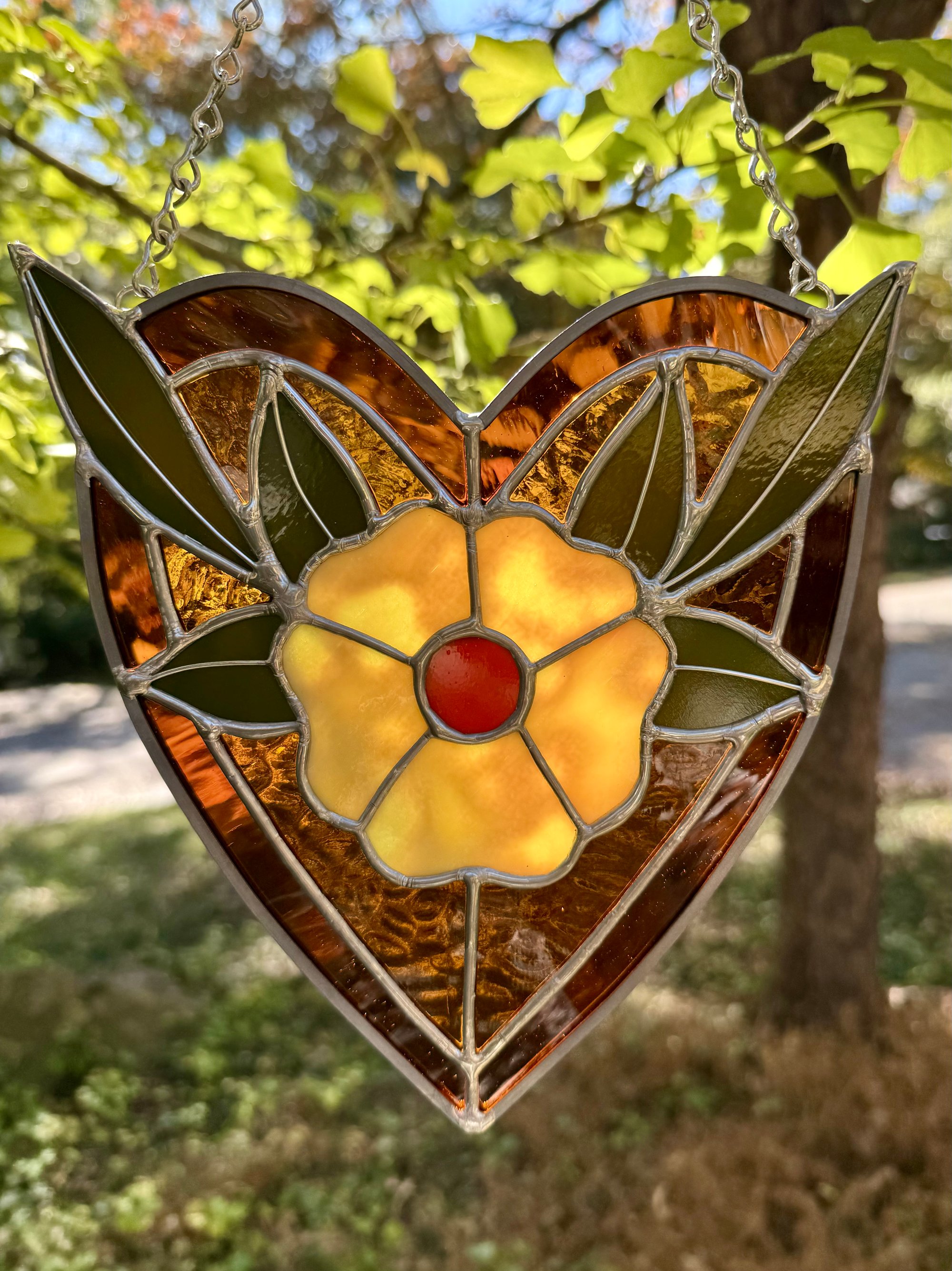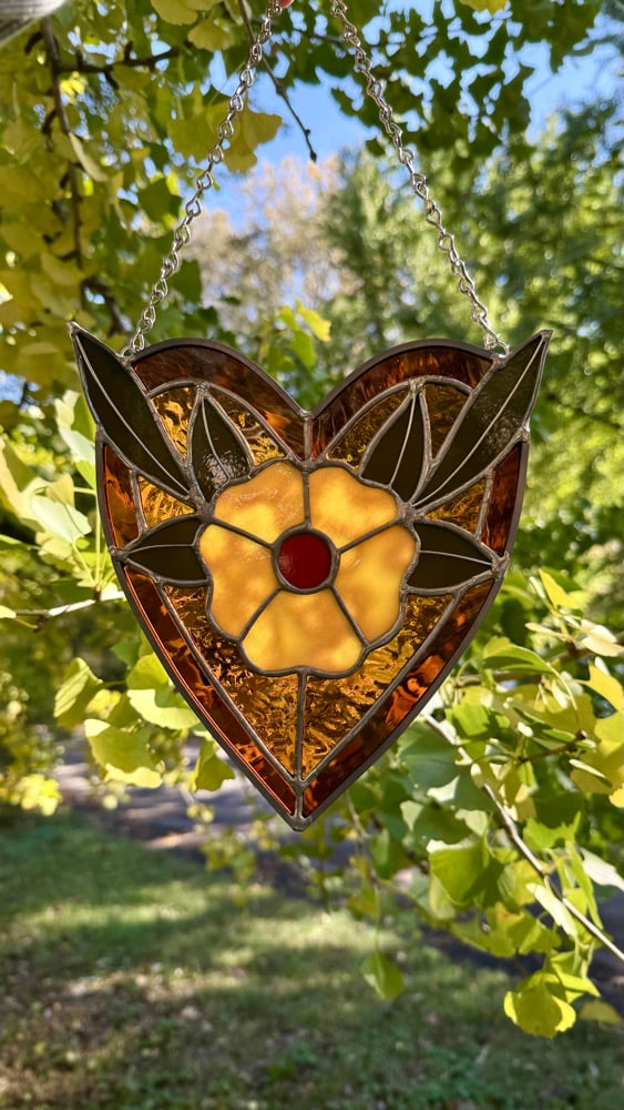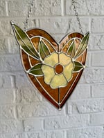 this piece features mottled yellow flower petals, opaque olive green leaves, and a textured light amber heart background with darker amber borders. hanging chain attached.
