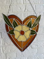 flower heart stained glass sun catcher. measures approximately 8" by 8".